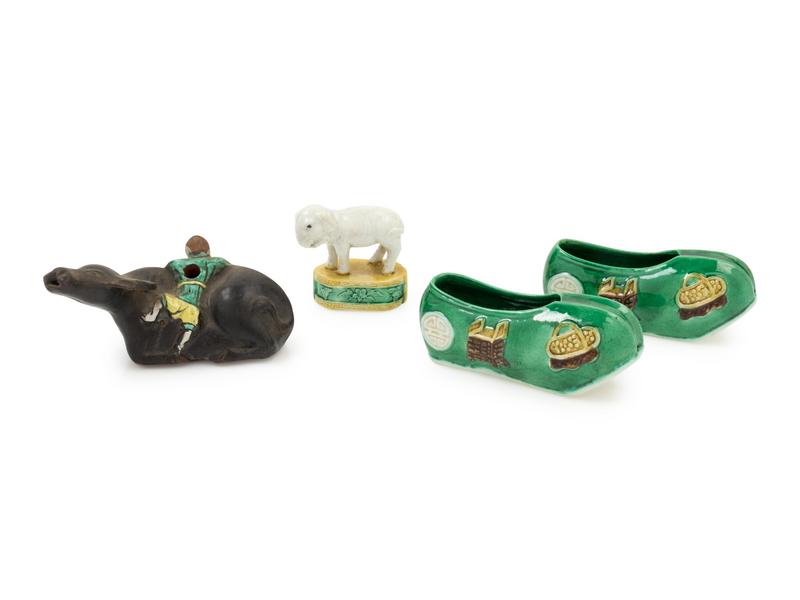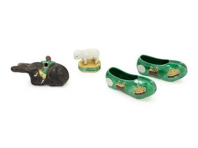 comprising two models of shoes, one figure of a sheep, and one figure of a boy riding mounting a recumbent water buffalo.