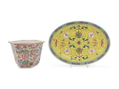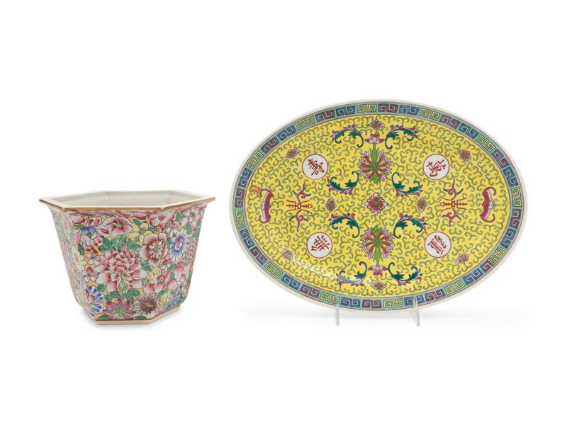 comprising a famille rose millefleur cachepot and a famille jaune platter.