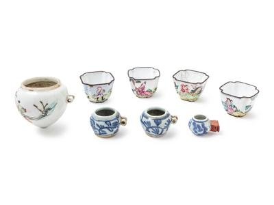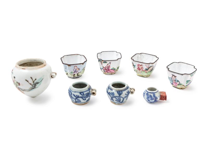 comprising four porcelain bird feeders and four Canton enamel on copper cups.