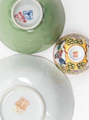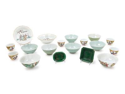 comprising six yellow ground cups, six celadon glazed bowls, four bowls decorated with figures, and two green glazed dishes.