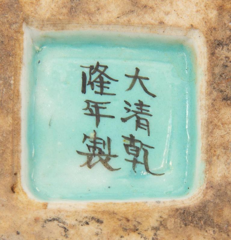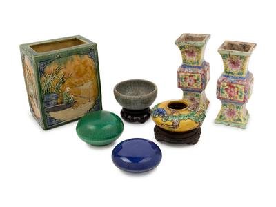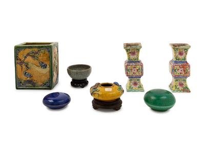 comprising one brush holder with carved and molded decoration; two famille rose candle holders; two monochrome covered boxes, one green crackle glazed, and one blue glazed example; one small crackle glazed bowl; and one small yellow water coupe with molded decoration.