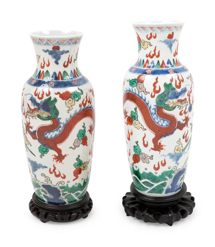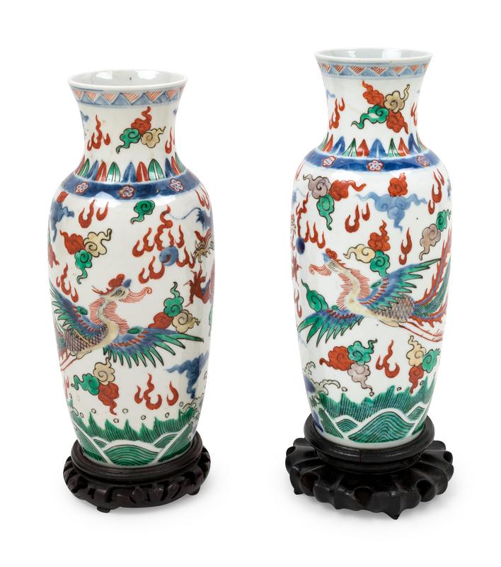 each of baluster form, painted to the exterior with a pheonix and a dragon chasing amidst stylized clouds.