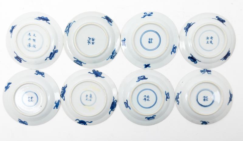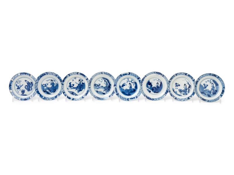 each with a central medallion of figures playing in landscapes, surrounded by raised latticed borders.