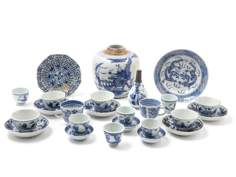 comprising one ginger jar, one small vase, two handled cups, eleven wine cups, and ten dishes.