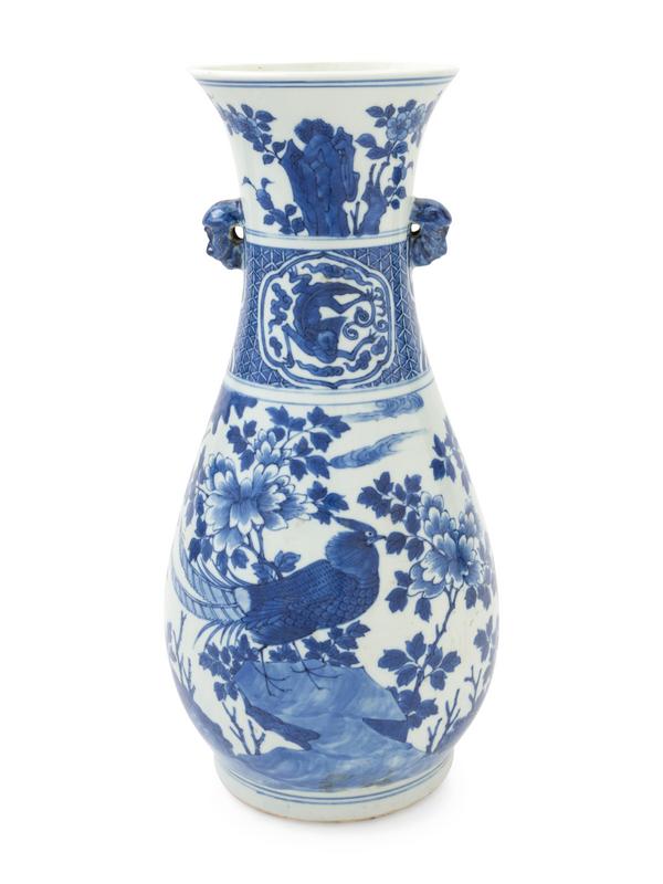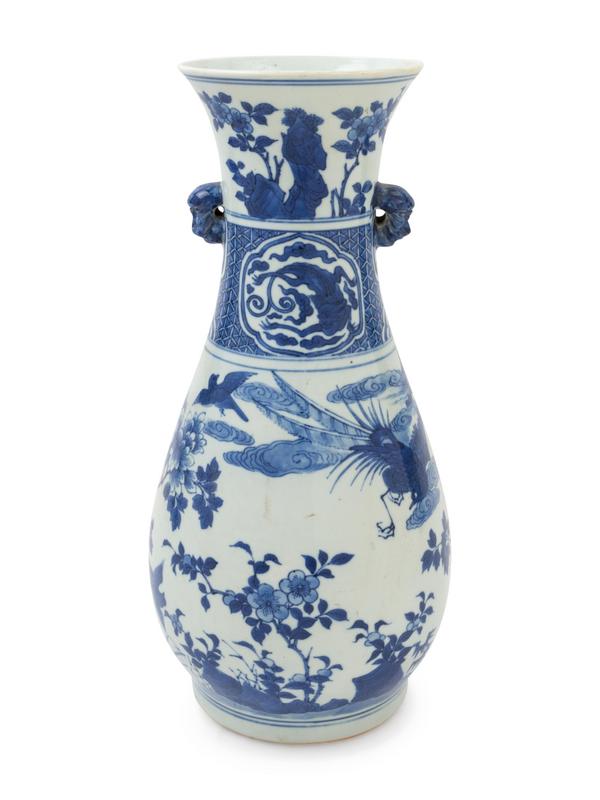 of baluster form with flared mouth rim, flanked to the neck with a pair of handles, painted to the body with birds and flowers.