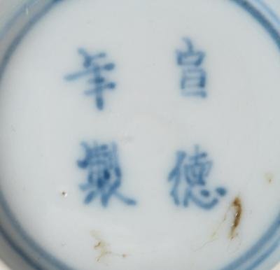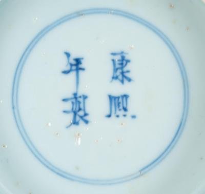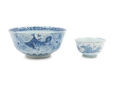 each has deep U-shaped sides rising from a short straight foot, the first painted with fishes in waves, the second painted with mountainscape.