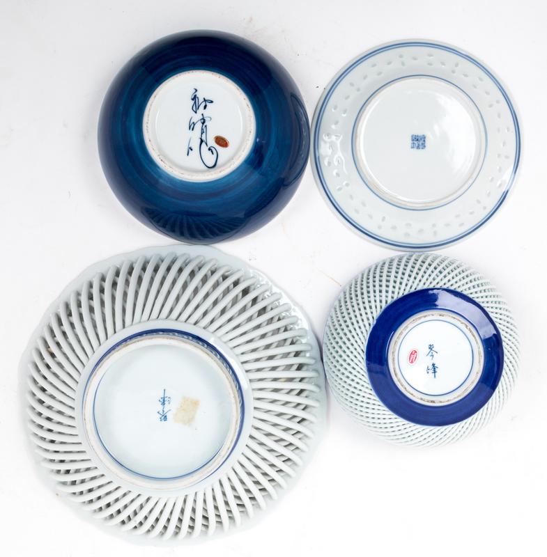 comprising seven Chinese export plates and one saucer, two Japanese reticulated covered dishes, and one Japanese reticulated bowl.