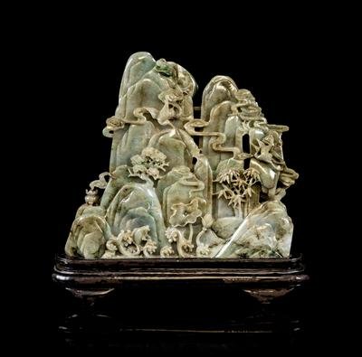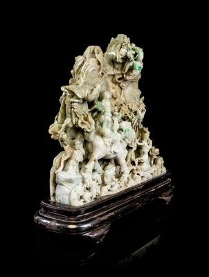 carved to depict various immortals in a mythical waterscape set against large craggy peaks, all raised above a hardwood stand.