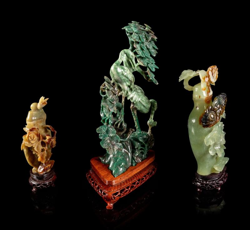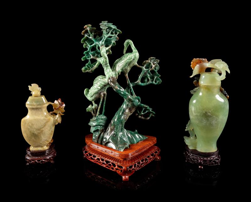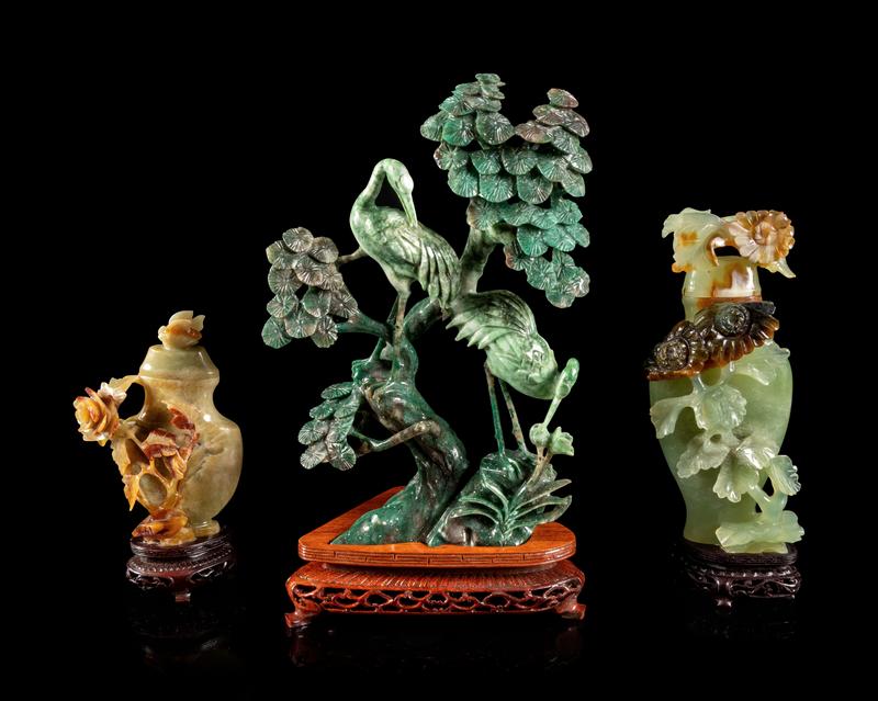 comprising a spinach jade carving of cranes underneath pine trees, a serpentine flower vase and a yellow hardstone flower vase.