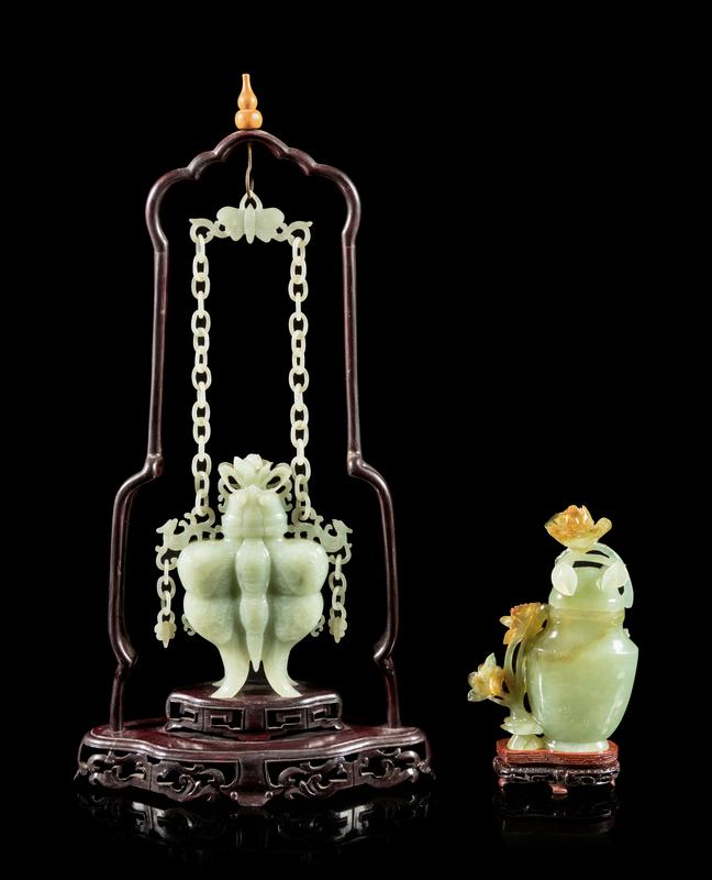 comprising one butterfly-form hanging covered vase suspended from a carved hardwood stand, and one covered vase with carved flowering branches, raised upon a hardwood stand.