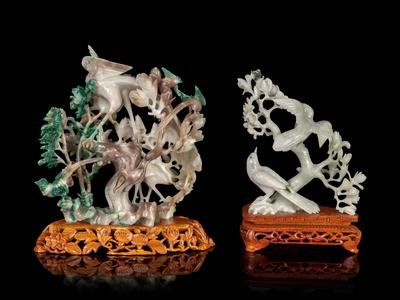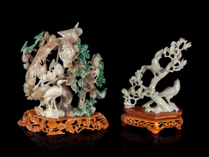 each reticulated with birds perched on branches, supported on fitted wood stand.