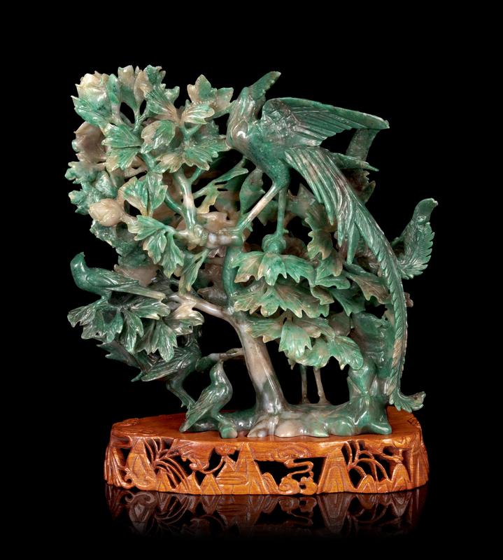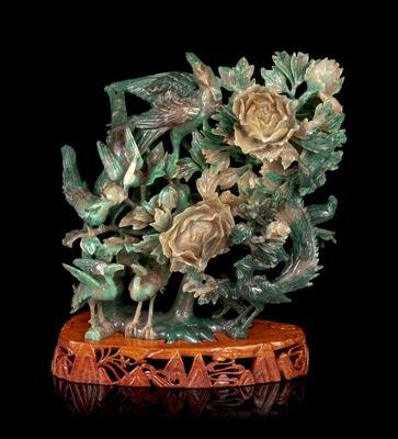 A Large Chinese Hardstone Figural Group of Birds and Flowers