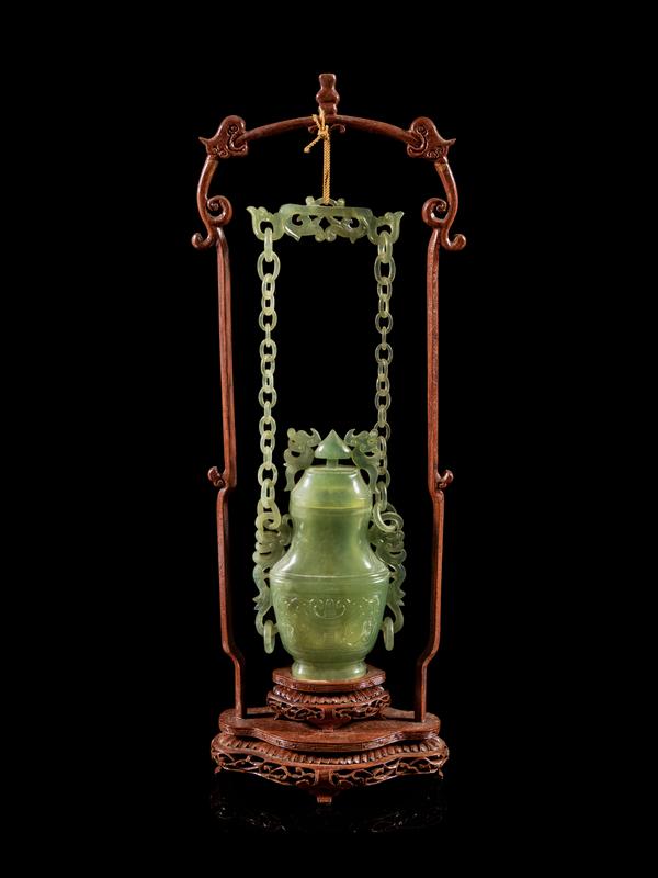 the flattened pear-shaped body rising from a flared foot to an gallery rim, all attached to two interlinked chains suspended from a wood stand.