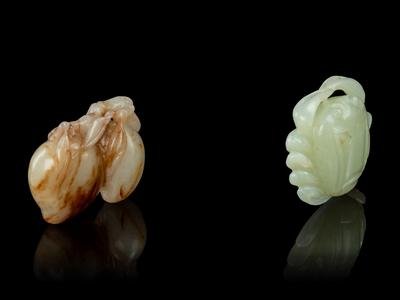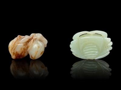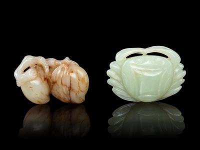 the first carved as a crab, the second carved as two peaches on the stem, each softly polished.