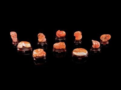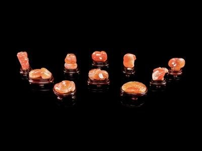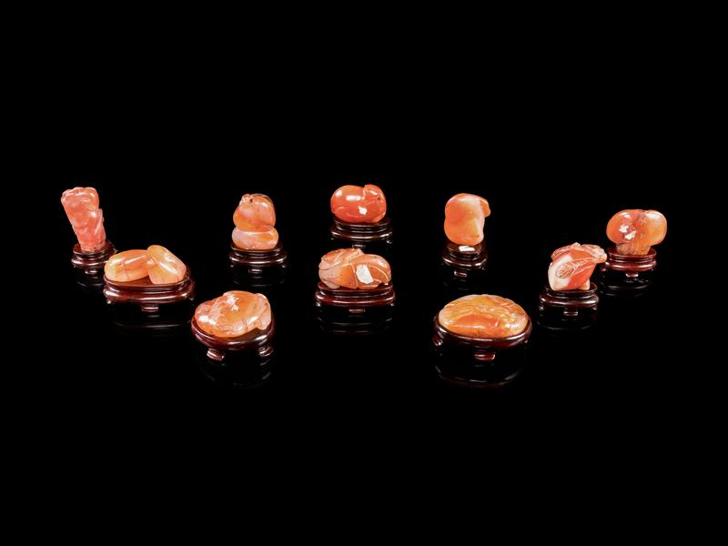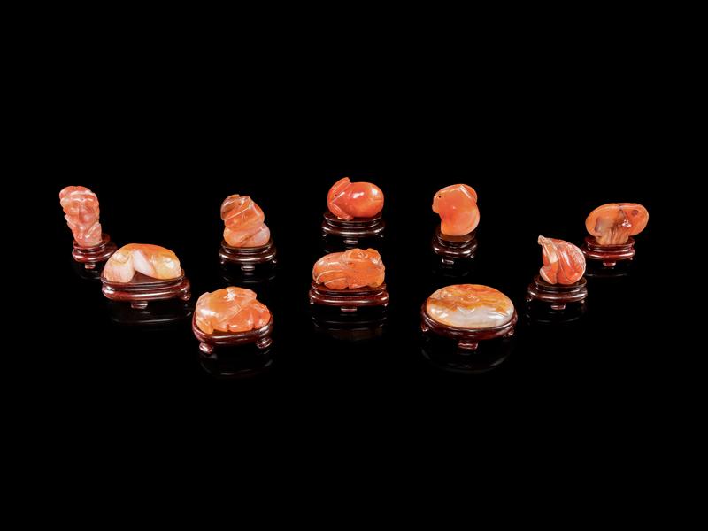 comprising oval-shaped plaques, fruit examples, and ruyi-form pendants, each with fitted wood base.