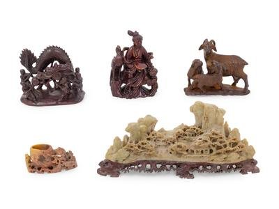 comprising a ram group, a lady figural group, a dragon group, and two scholar's table objects.