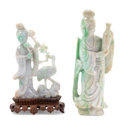 Two Chinese Apple Green and White Jadeite Figures of Female Immortals