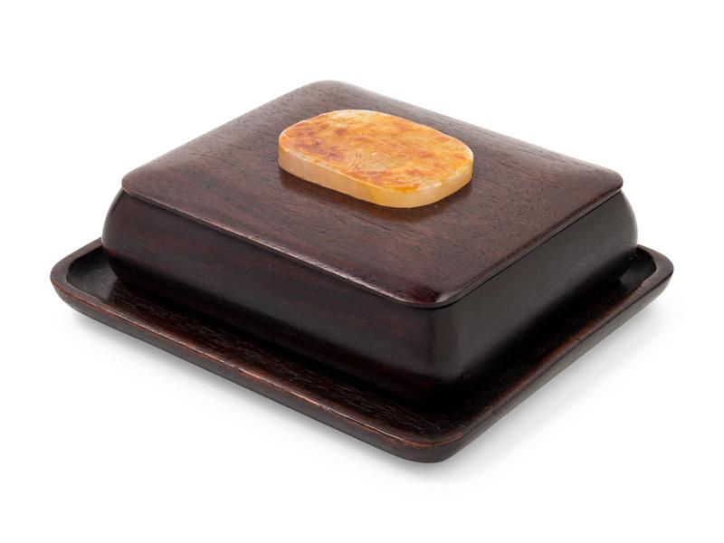 the box and tray of rounded rectangular form and well polished, inset with an oval-shaped white and russet jade plaque.