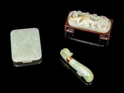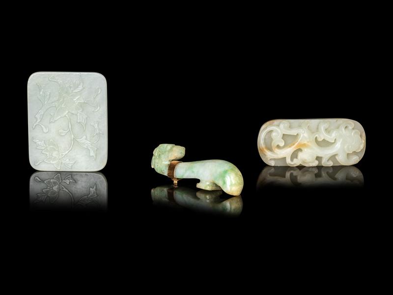 comprising one jadeite belt hook, one jade belt hook, and one belt plaque.