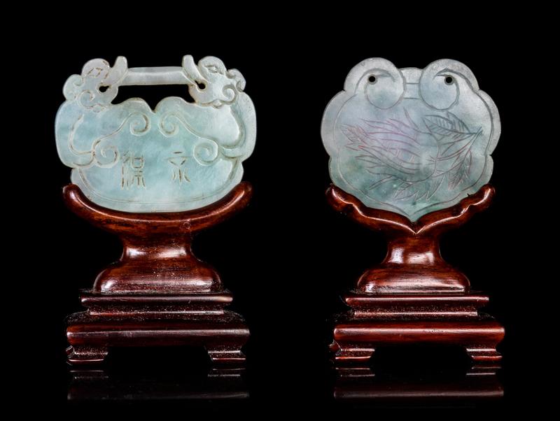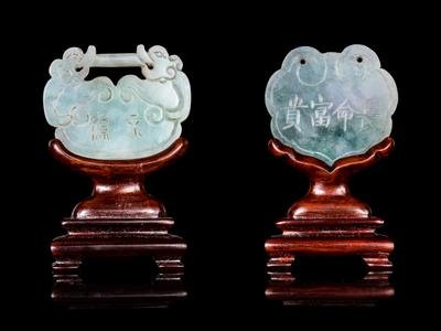 Two Chinese Jadeite Lock-Form Pendants