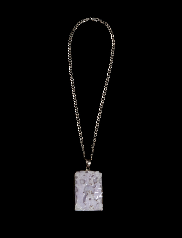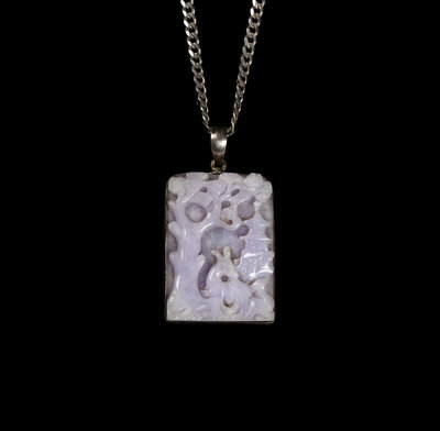 the rounded rectangular jadeite plaque carved to show a deer underneath pine trees, the reverse incised with bamboo, with silver mountings.
