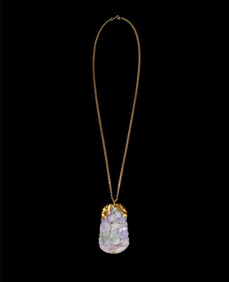 the lavender and apple green jadeite pendant carved to show a dragon and a phoenix amongst clouds, having 22k yellow gold mountings and a 14k yellow gold chain.