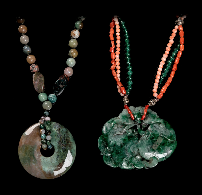 the first comprising green glass and coral beads, suspending a large apple green jadeite pendant, carved to show bats resting on two persimmons; the second with rounded jadeite, spinach jade and hardstone beads and a russet and celadon jadeite bi disc.