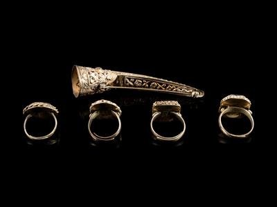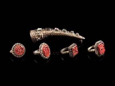 comprising four rings, each inset with cinnabar lacquer decoration, and one nail protector with hardstone inlaid.