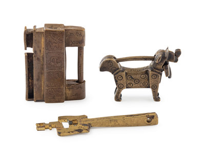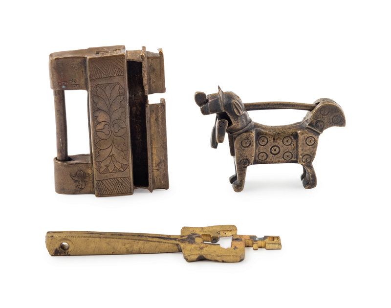 the first of rectangular form with the inner lock, key, the second in the shape of a dog.