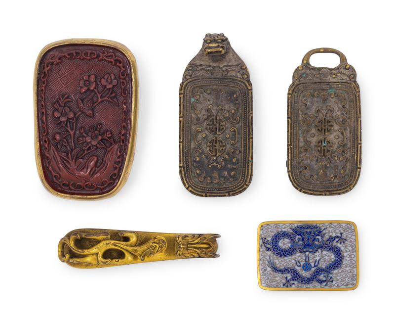 comprising a rectangular cloissoné example with a writhing dragon on a pale blue ground, a slender gilt metal example composed of opposing chilongs, a carved metal mounted example, and an interlocking set of cast metal examples, with encrustations.