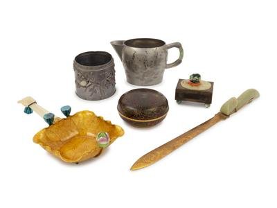 comprising a pewter teapot with a hardstone mounted handle; a pewter container with hardstone inlays; a hardstone mounted match box holder; a cloissoné covered box; enameled iron with hardstone handle; and a jade and gilt mounted letter opener.