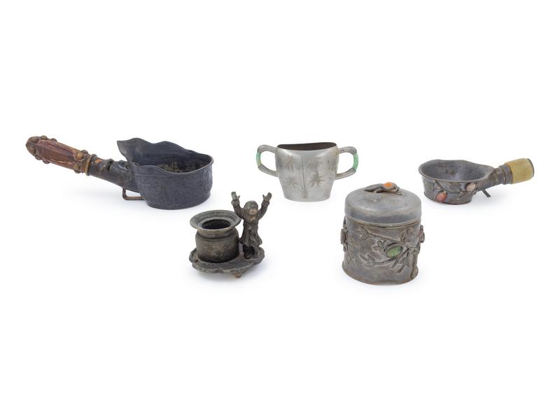 comprising two irons, one covered box with hardstone inlays, one double handled pot with jadiete inlays, and one pen holder.