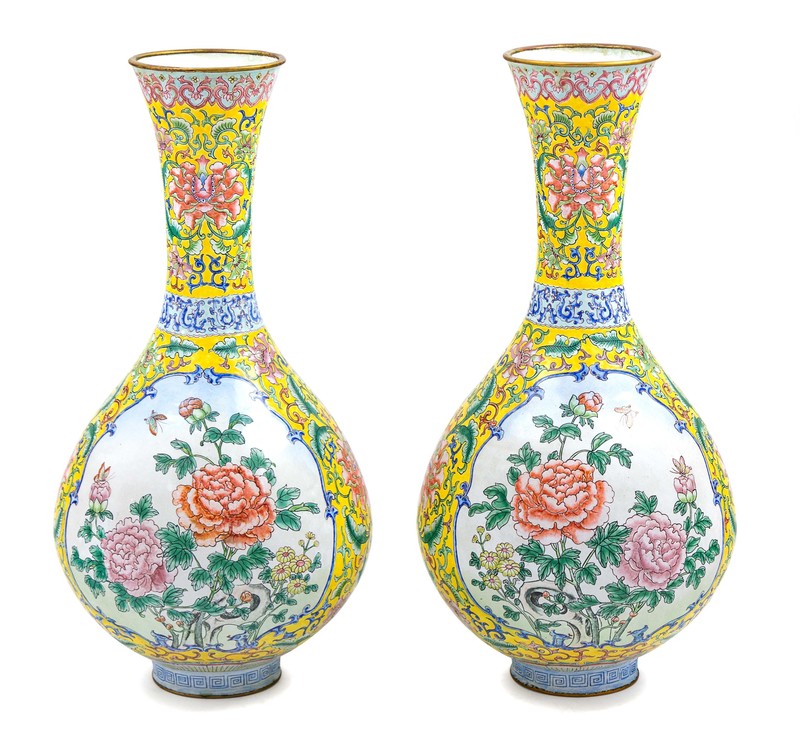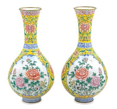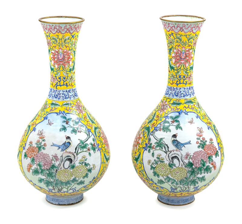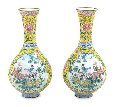 民國 廣式銅胎畫琺瑯開光花鳥紋賞瓶一對