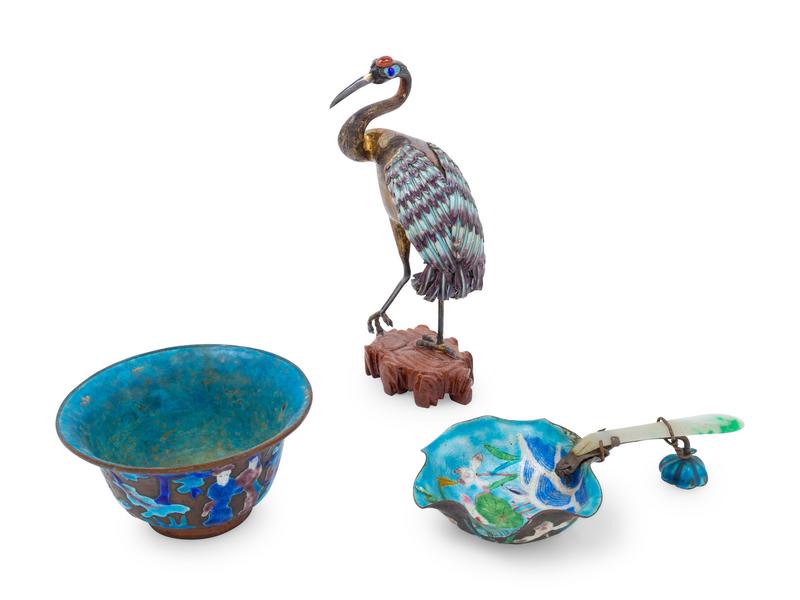 comprising a cup, an iron mounted with a hardstone handle, and a figure of a standing crane.