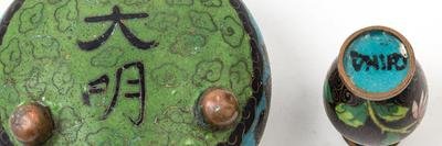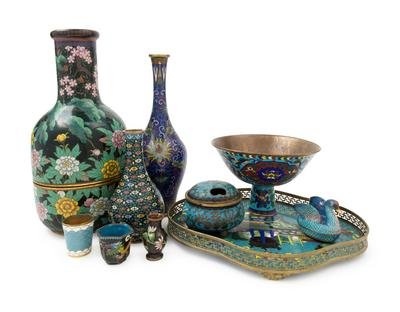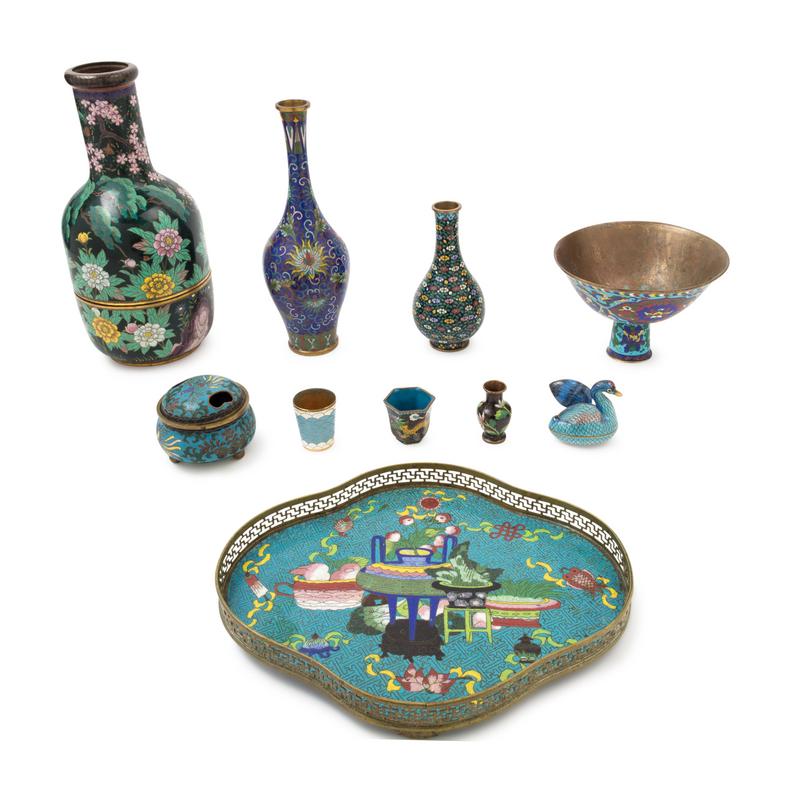 comprising a stem cup, a tray raised above ruyi head from feet, a covered box in the form of a goose, a miniature baluster vase, two cups, a burner, and three bottle vases.
