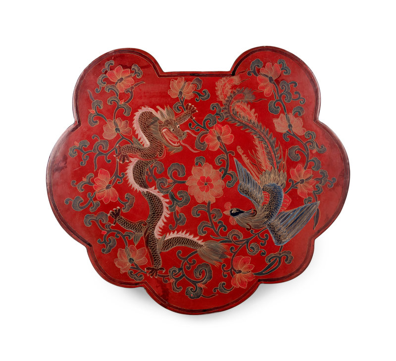 of ruyi-head form, painted a dragon and a phoenix in polychrome lacquer against a rich red lacquer ground.