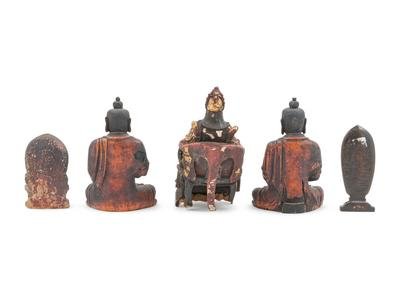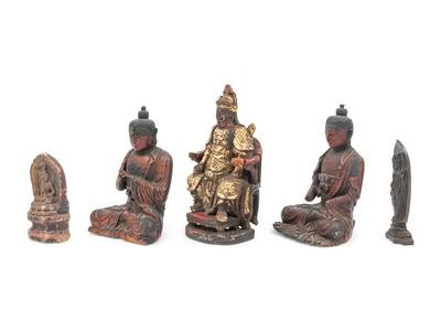 comprising a pair of seated Buddhas, a small bronze Guanyin, a gilt wood Guangong, and a sino-tibetan tara.