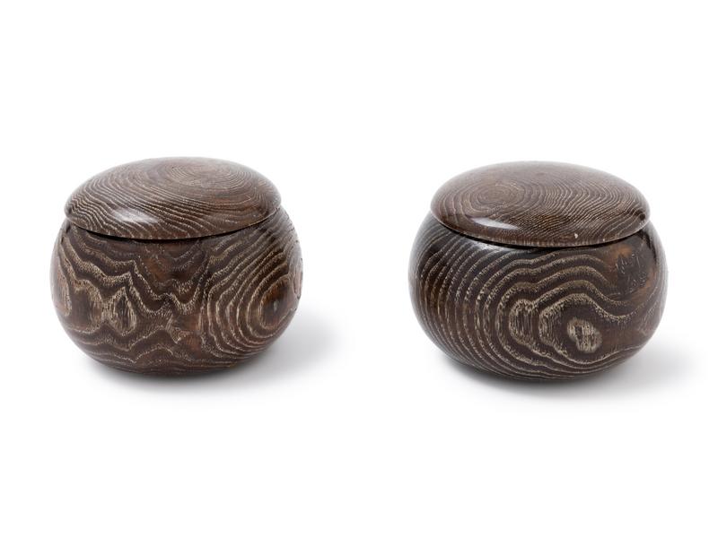 each of globular form with a conforming lid, shaped to show pale grain, together with associated chess pieces.