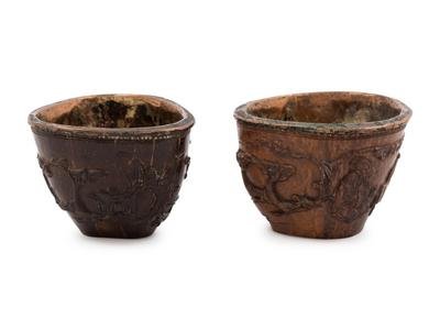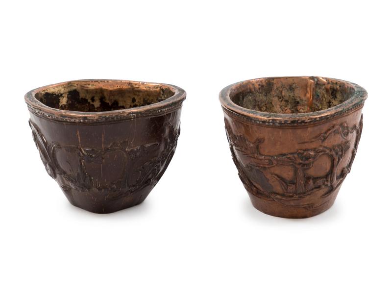 A Pair of Chinese Silver Inlaid Carved Bamboo Cups