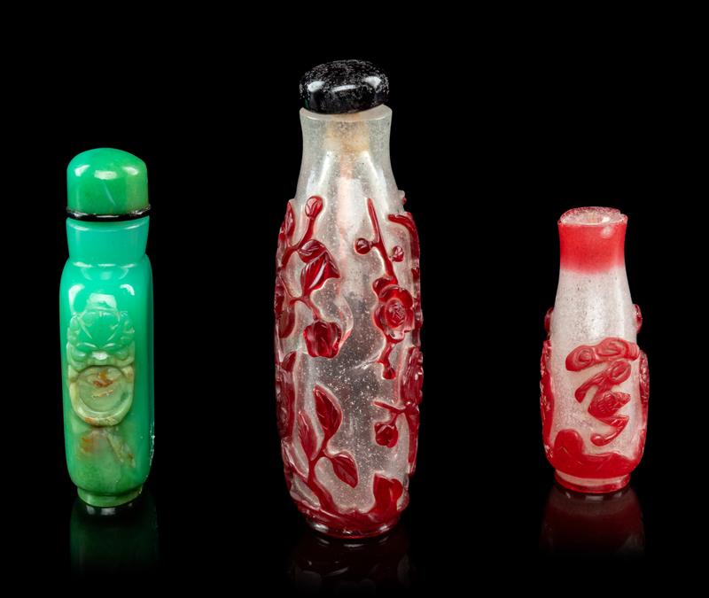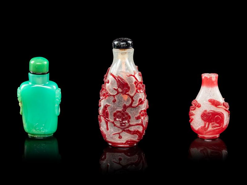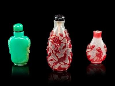 comprising an opaque apple green example with a matching lid, a translucent example with ruby red overlay and black stopper, and a red overlay example.