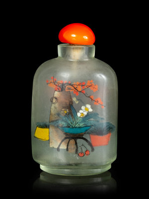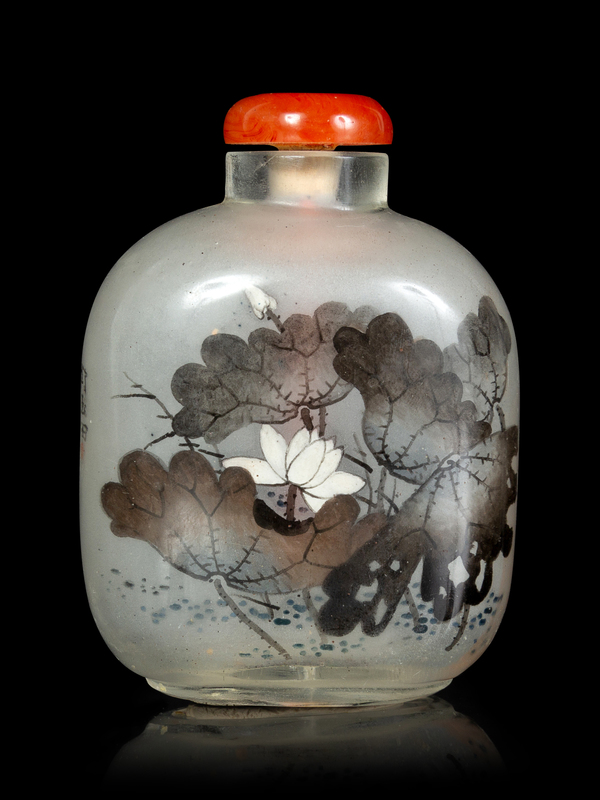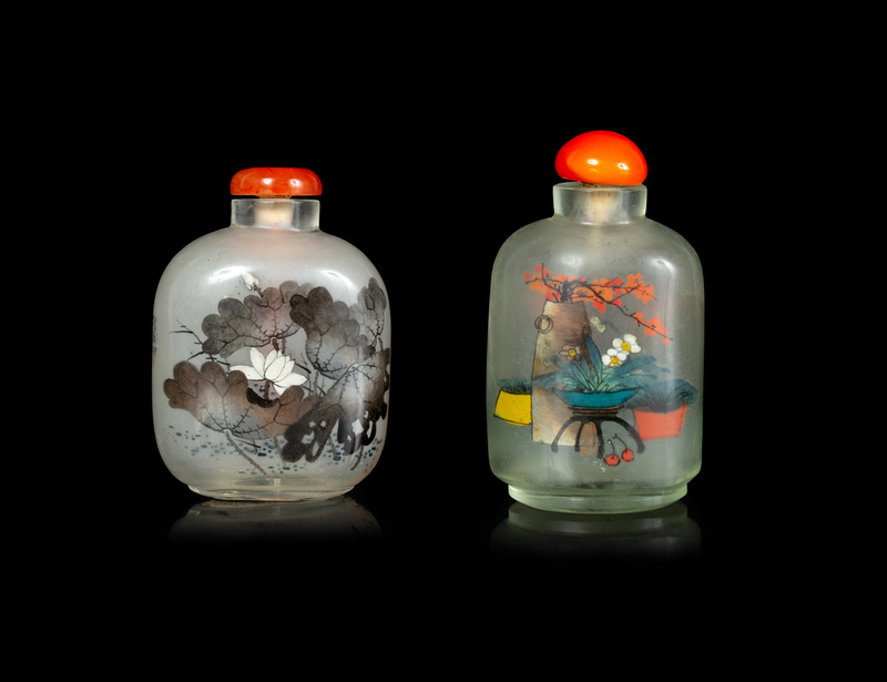 each of baluster rectangular form, the larger example painted with lotus pond scene and dragonflies above leafy plants, signed Yan Yutian (late Qing dynasty/Republic Period); the smaller example painted to show flower-filled vases and gold fish, red glass stoppers.