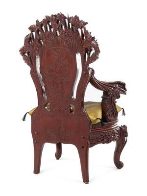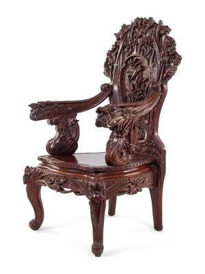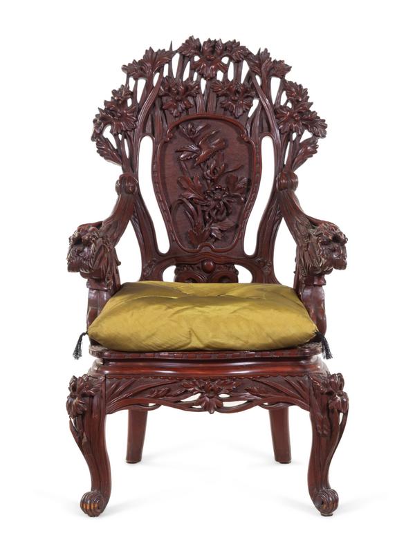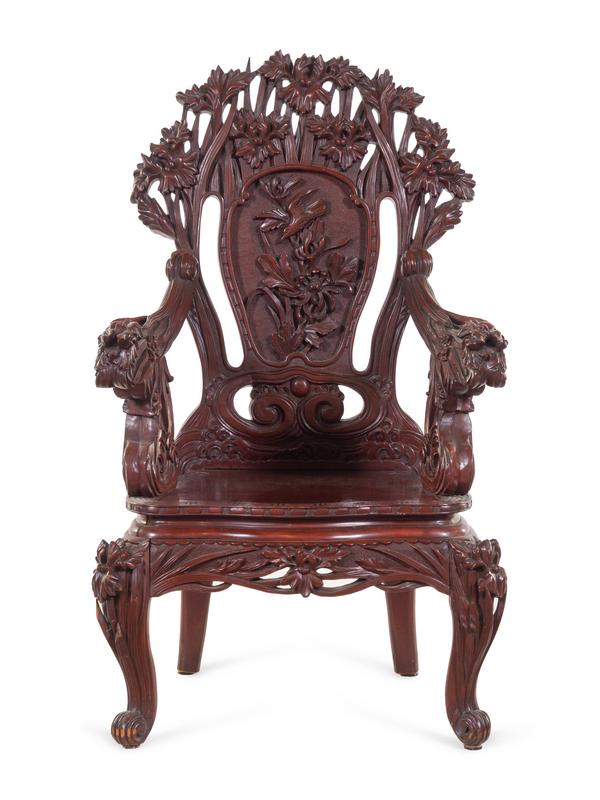 the arched U-form crestrail reticulated with iris decorations, the S-shaped legs joined by a stretcher of similar decoration.