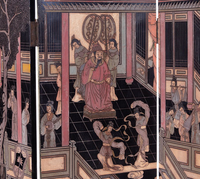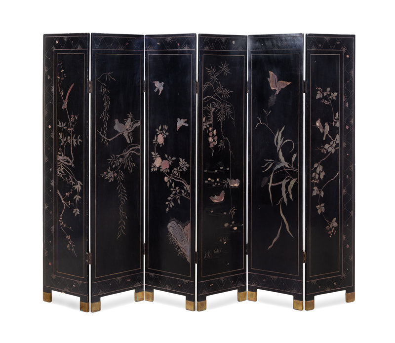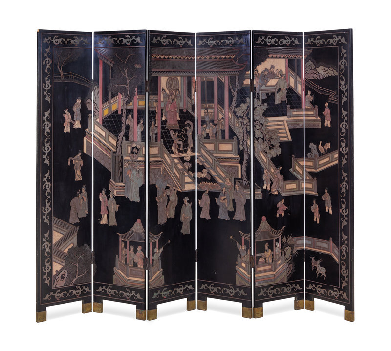 A Chinese Six-Panel Coromandel Polychrome Lacquered Floor Screen