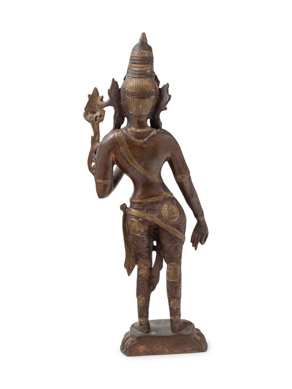 the deity depicted standing on a single lotus base, her body slightly swayed to the side, wearing a loose dhoti and a peaked crown.