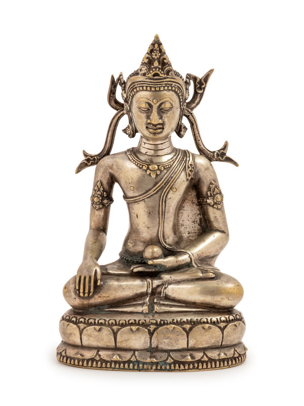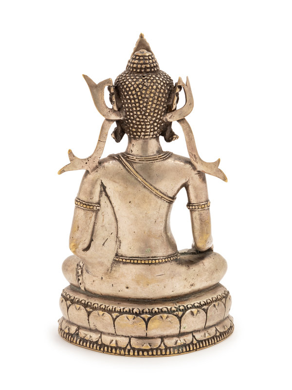 the deity depicted seated on a double lotus plinth, the left hand lowered holding a pearl of wisdom, the right hand touching the right knee, wearing a peaked crown.