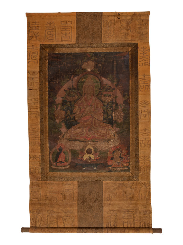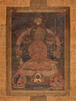 depicted a Lama seated on a raised lotus pedestal, within an elaborate frame decorated with scrolling acanthus.