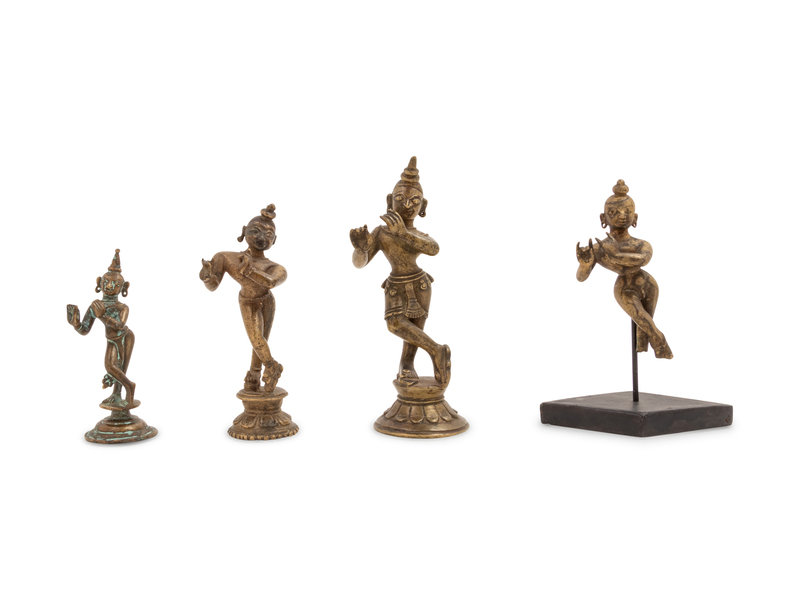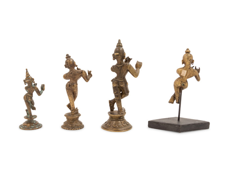 each figure standing with legs crossed and hands raised as if playing a flute.