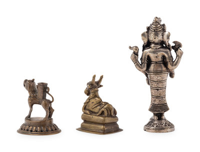 the first a figure of a standing Genesha, the second a figure of a bull, the third a candle holder in the form of a mythical beast.