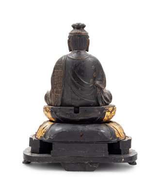 the deity depicted seated on a large lotus plinth, dressed in drape robes with a shawl covering her shoulders, her left hand bearing a bottle, her right hand resting on her lap, her face carved with a calm expression, all hair pulled to a high chignon.