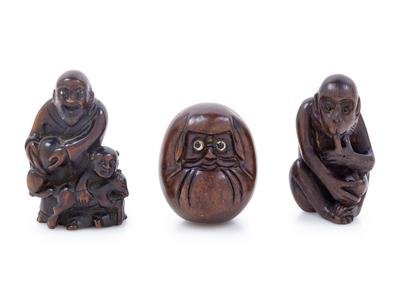 the first carved to show an elderly and a child, the child embracing a goat; the second showing a monk dressed in robes; the third a seated monkey.